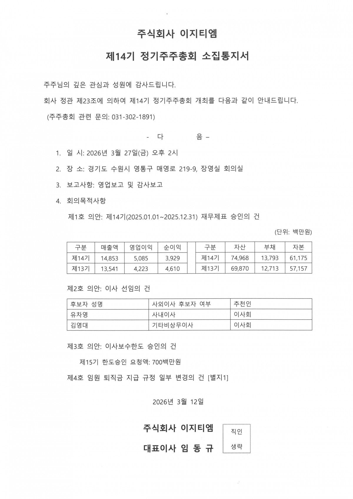 제14기 정기주주총회 소집공고 페이지 정보 작성자 최고관리자 댓글 0건 조회 9회 작성일 26-03-12 17:45 제14기 정기주주총회 소집공고 목록 프린트 다음글 제14기 임시주주총회 소집공고 댓글목록 댓글목록 등록된 댓글이 없습니다.